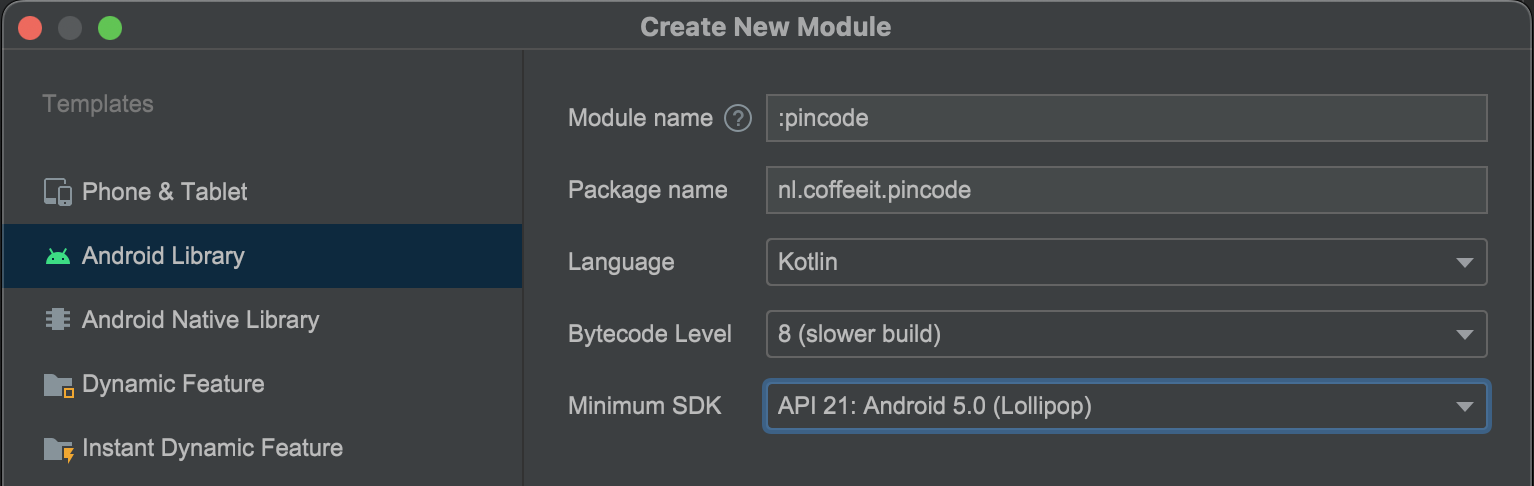 If you want to create an Android library like the Pincode component, it’s easiest to create a library and a sample app in the same Android Studio project. This way, you won’t have any app-related code in your component and the app is able to make use of the latest changes of the component, without having to publish the component’s dependency first. To achieve this, create a new project. The automatically created module will be your sample app. Then create a new module in the same project.